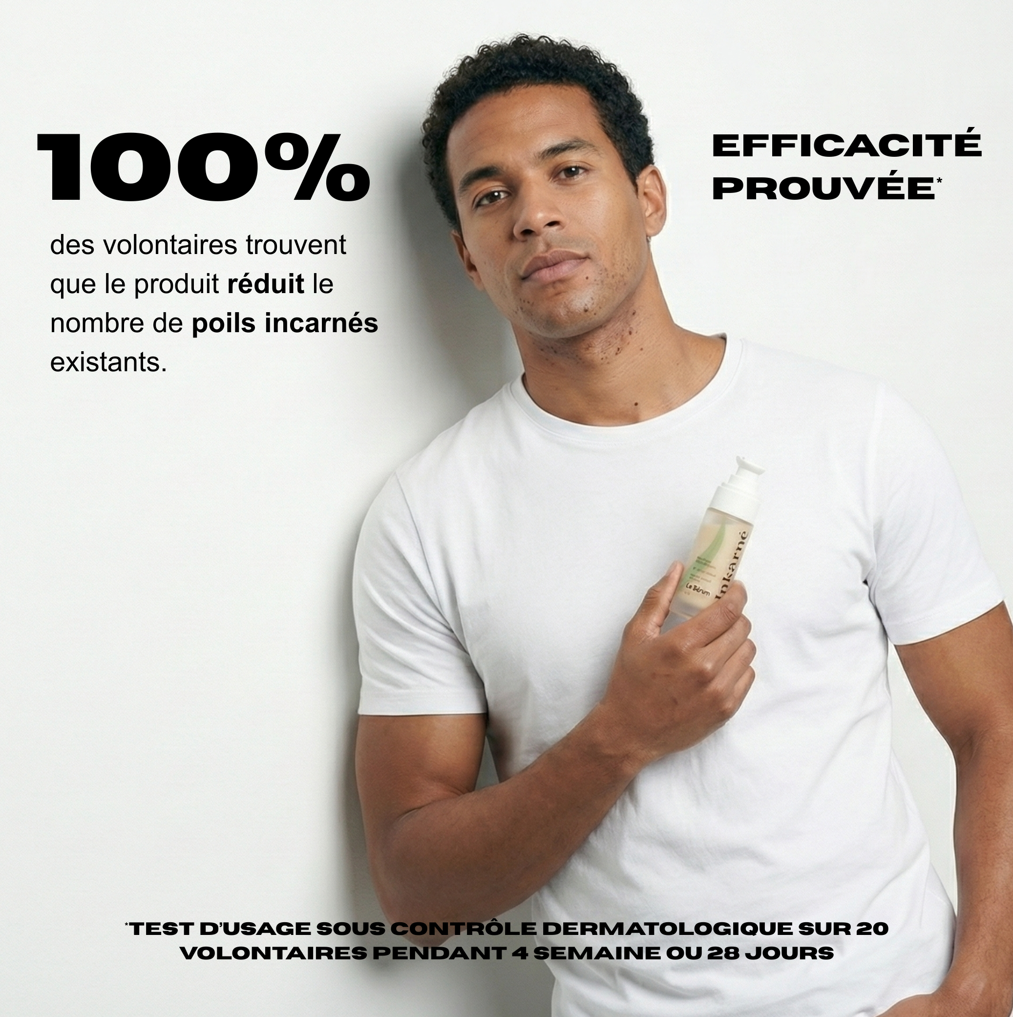 100% des volontaires trouvent que le produit réduit le nombre de poils incarnés existants. Test d’usage sous contrôle dermatologique sur 20 volontaires pendant 4 semaines.