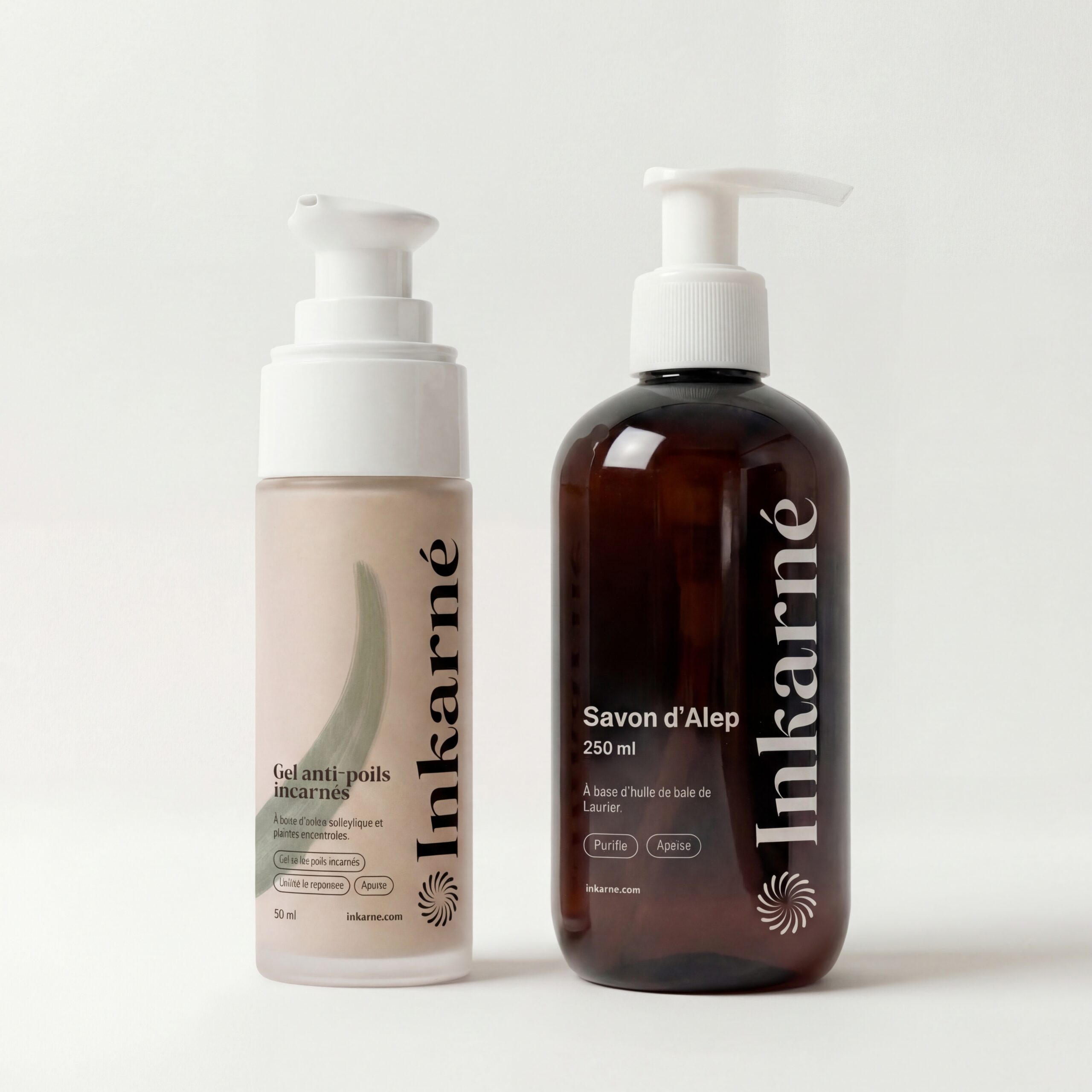 Traiter les poils incarnés ne doit pas être synonyme de souffrance. Si votre peau tiraille, rougit facilement ou marque après chaque épilation, le Pack Douceur est fait pour vous. Ce duo associe l’efficacité clinique de notre crème Inkarné à la sagesse ancestrale du Savon d’Alep liquide. C’est le mariage parfait entre la technologie française et la tradition orientale.