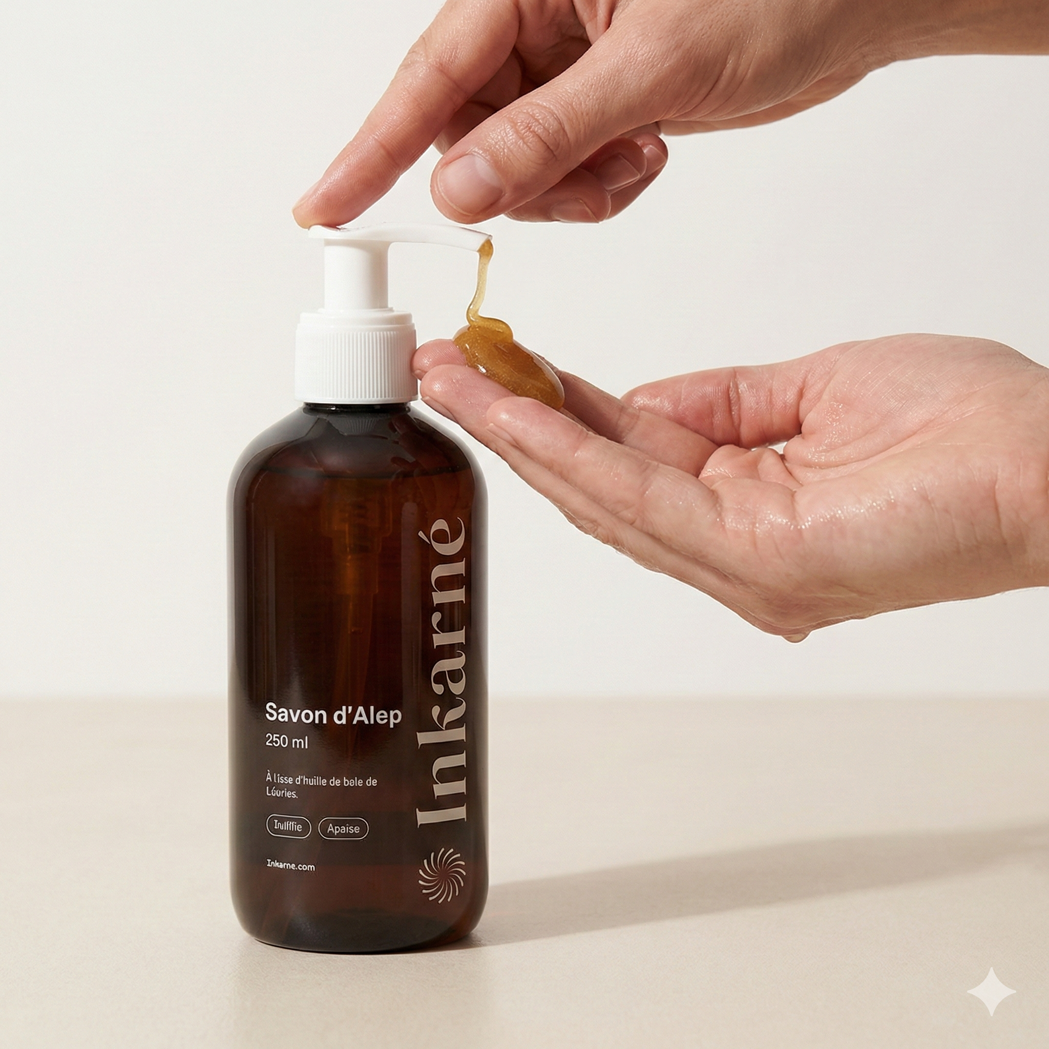 Jours « Récupération » (Mardi, Vendredi, Dimanche) : Utilisez le savon d’Alep liquide. Profitez de sa douceur pour masser la peau. Rincez. Appliquez la Crème Inkarné. Objectif : Restaurer le film hydrolipidique et apaiser.