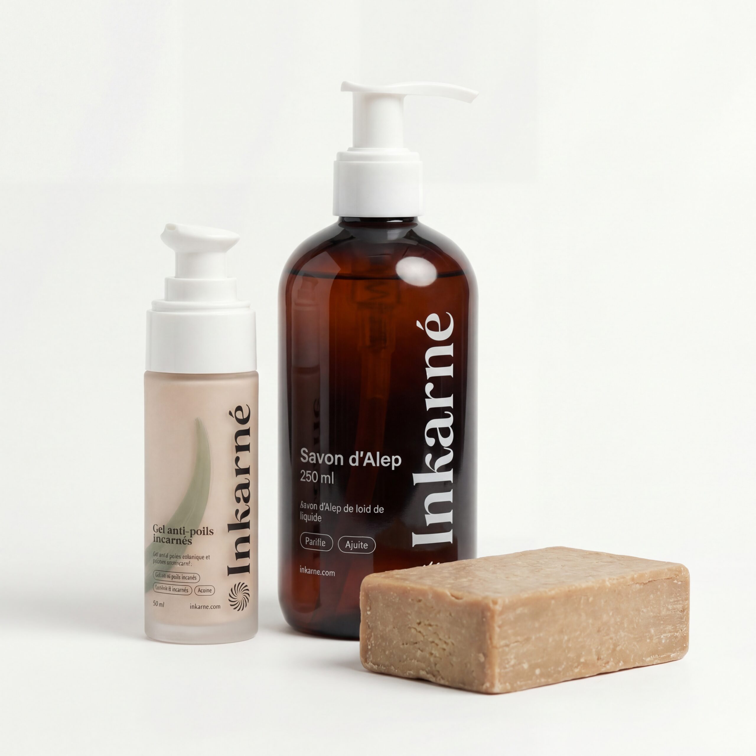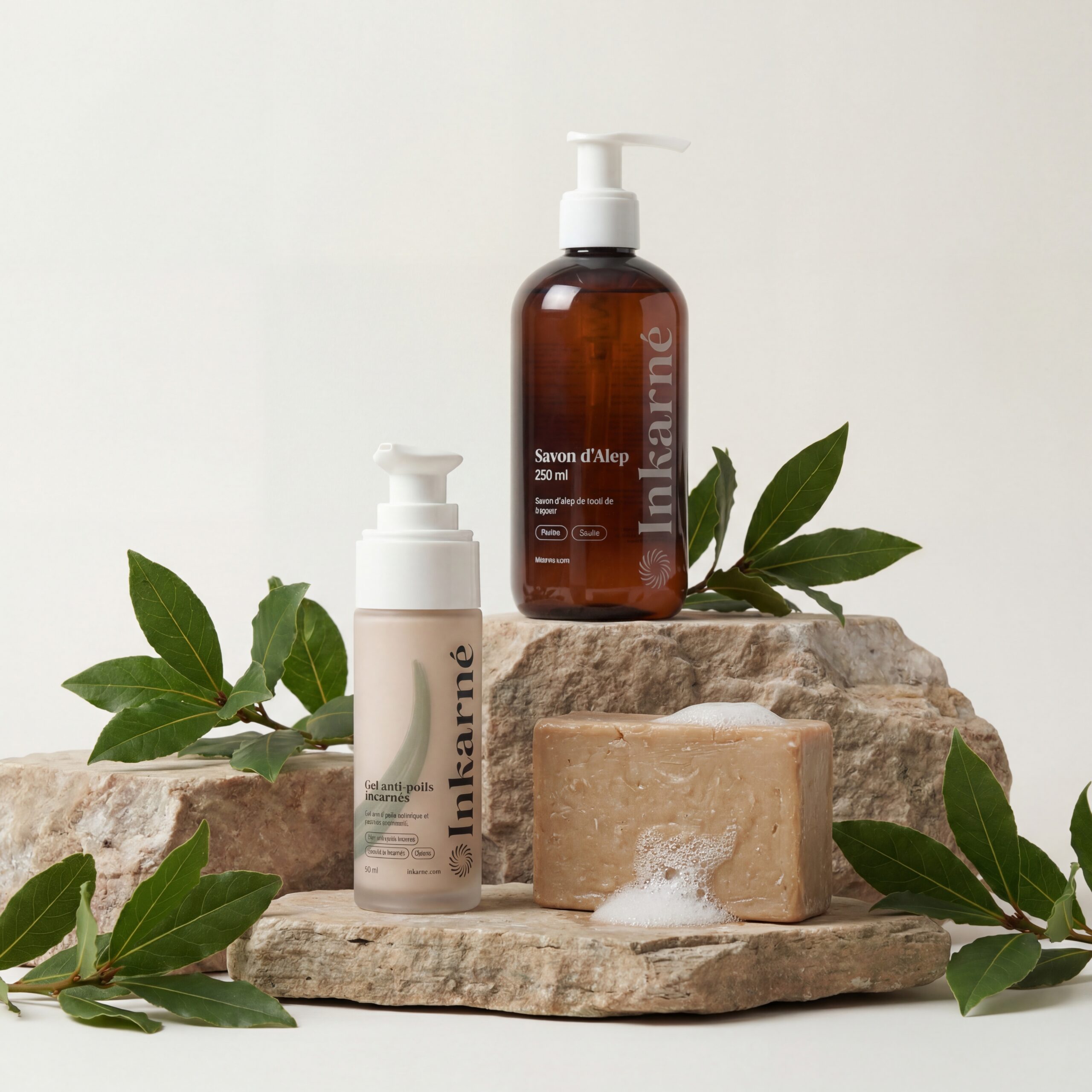 Le Jour J (Épilation/Rasage) : Utilisez impérativement le Savon d’Alep avant et après l’acte pour éviter toute réaction. N’appliquez la Crème Inkarné que le lendemain pour laisser la peau cicatriser naturellement.